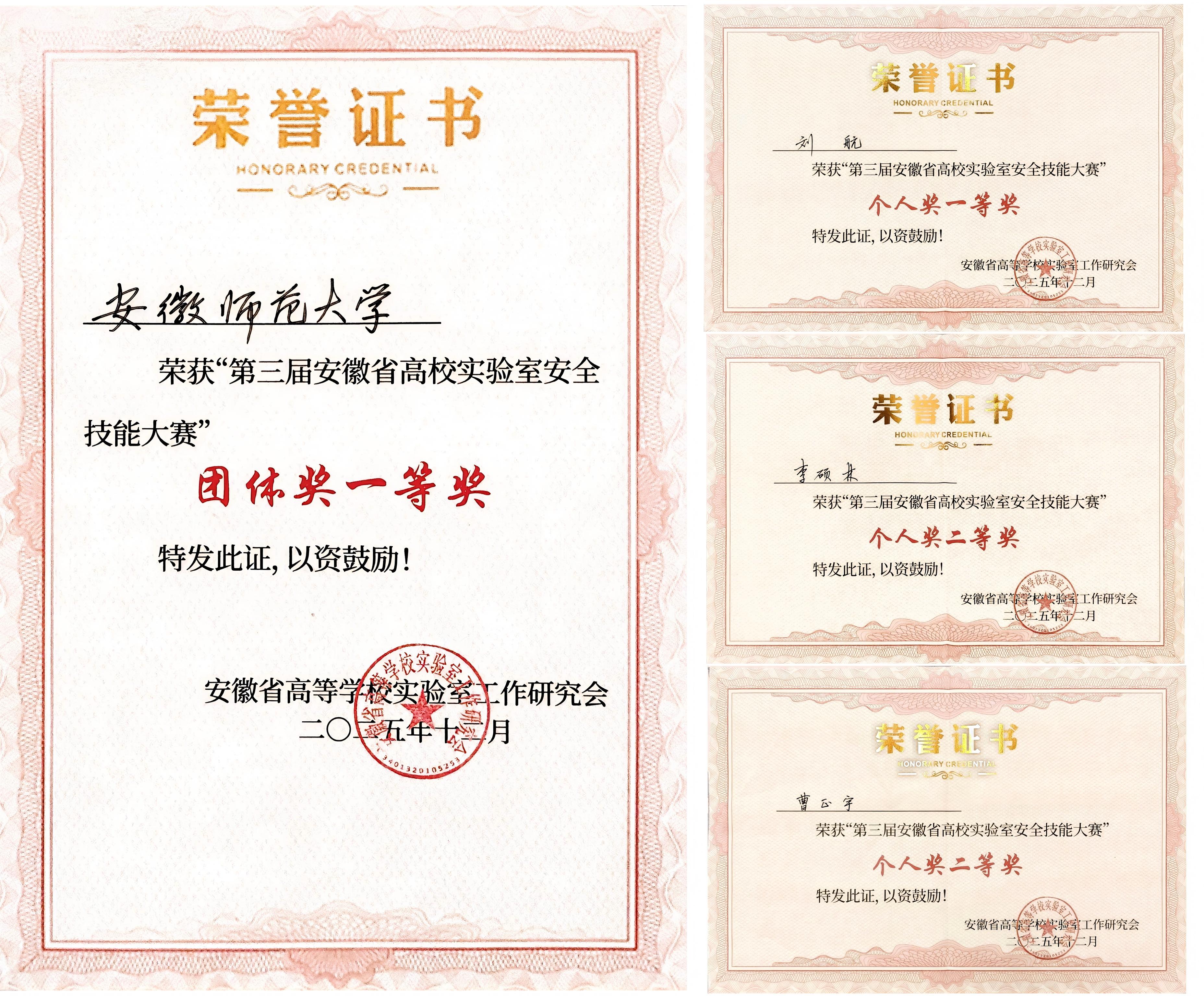 12月17日至20日,由安徽省高等学校实验室工作研究会主办的“2025年安徽省高校实验室建设与管理研讨会暨第三届安徽省高校实验室安全技能大赛”在黄山学院举行。我校代表队在48支高校参赛队伍中脱颖而出,连续三年获团体一等奖。刘航荣获个人一等奖,李硕林和曹正宇荣获个人二等奖。